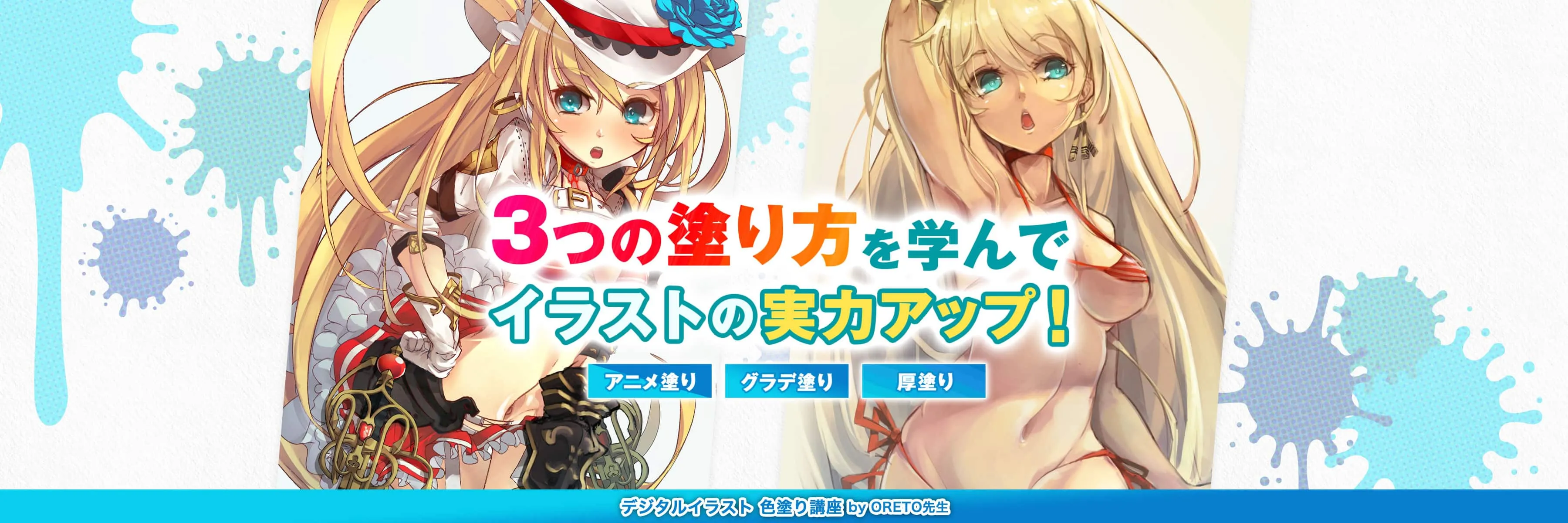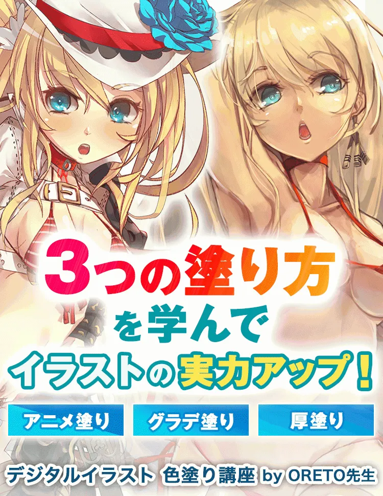 この講座は、「アニメ塗り」「グラデ塗り」「厚塗り」の3つの色塗り手法が学べるカラーイラスト講座です。