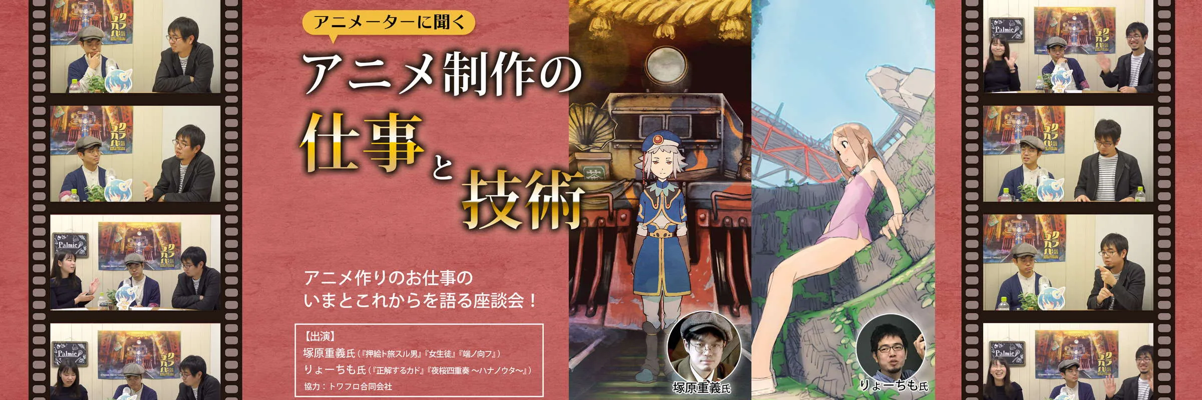 自主制作アニメーション作家の塚原重義さんと、デジタル技術に詳しくマルチに活躍するアニメーターりょーちもさんのお二人をお招きして、お二人がプロになるまでの経歴や、現在のお仕事の仕方、これからの作品制作の展望、実際のアニメの作り方や技術について、Q&Aインタビュー形式でお話を伺います。