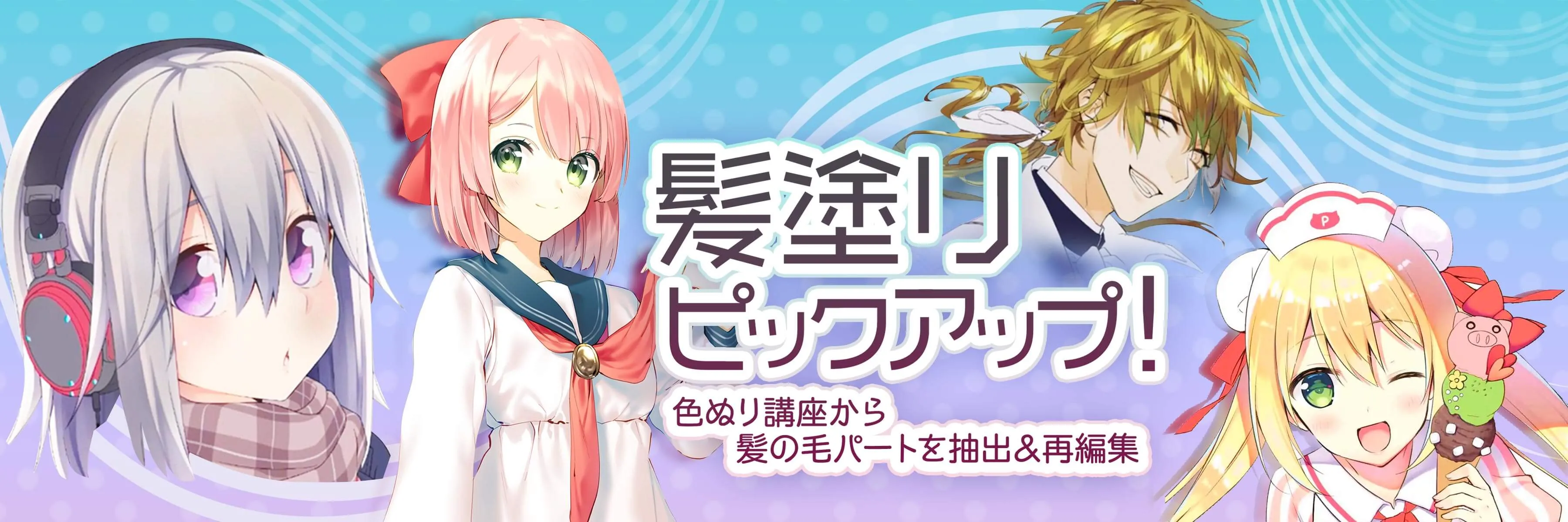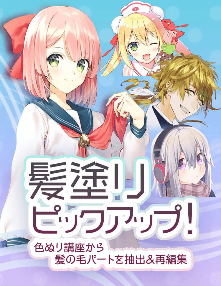 この講座では、いくつかの色ぬり講座から、タイプの違う髪の毛の塗りをピックアップ。見比べられるようになっています。