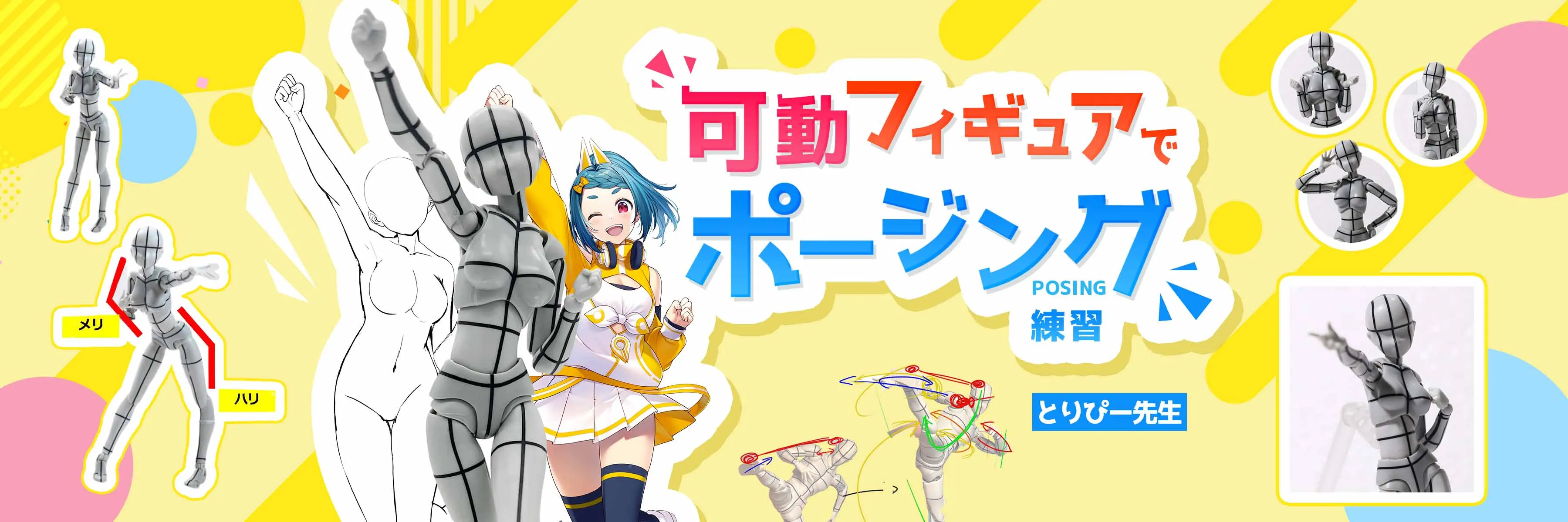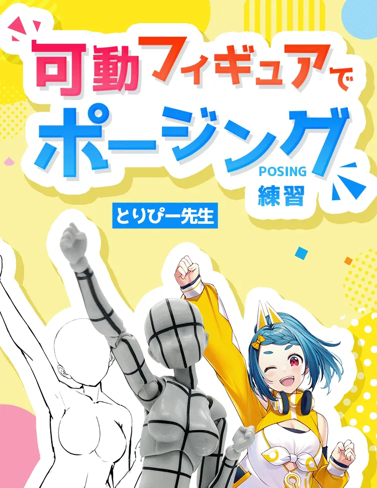 この講座は、キャラクターイラストを描く際に「ポーズを考える工程」を短縮するため、可動フィギュアを使ったポージングのコツを学ぶ講座です。