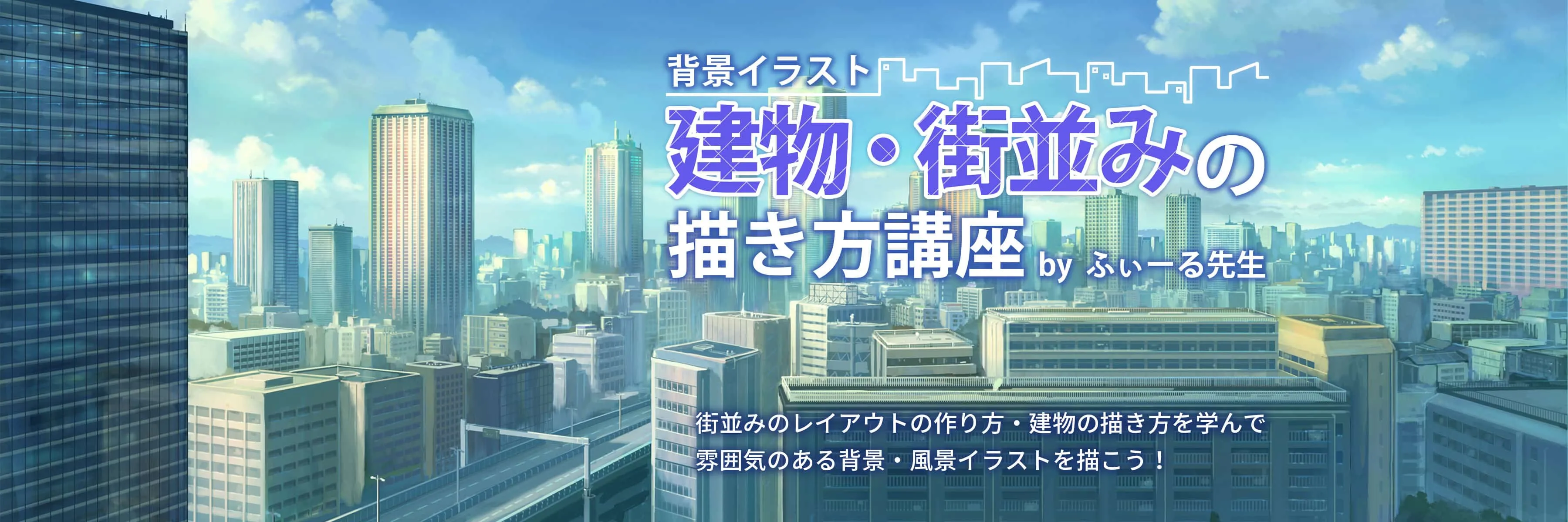 この講座は、現代風の建物や街並みの描き方を学ぶ背景イラスト講座です。