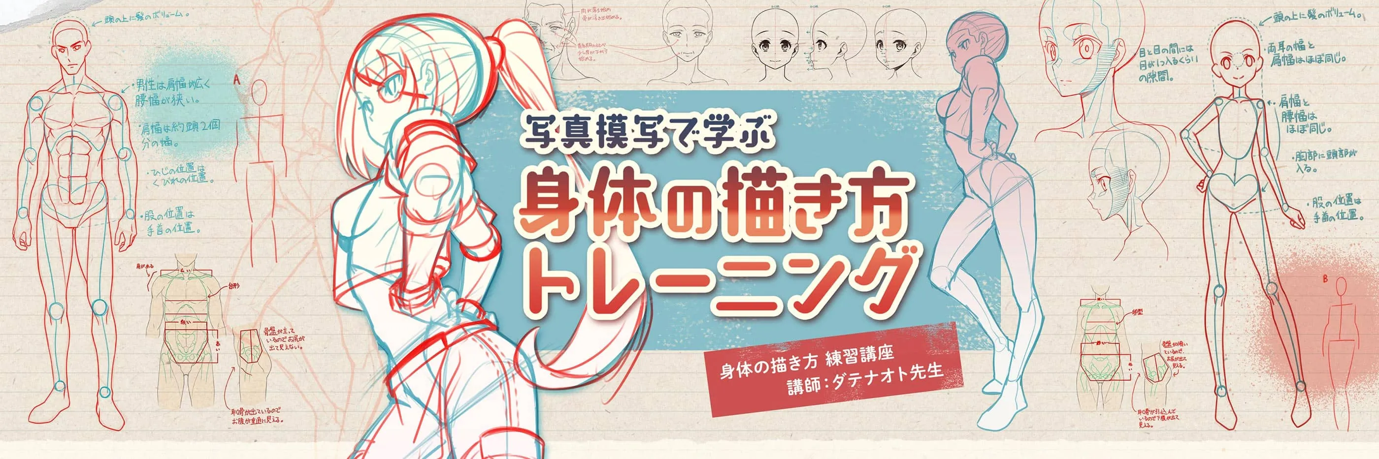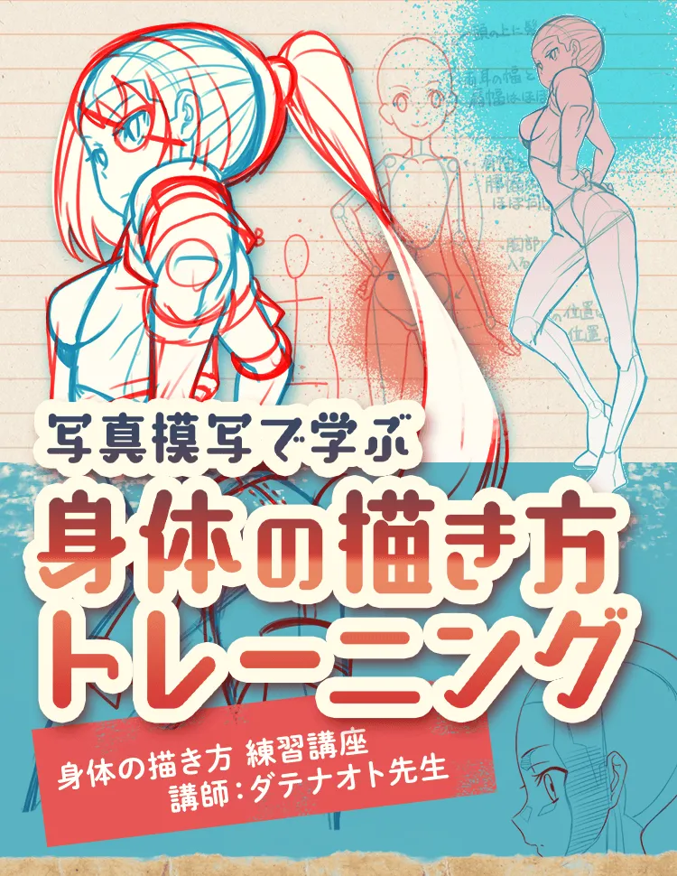 講師は、イラストやマンガの個人講師をしているダテナオト先生。これまで数多くの生徒を教えてきた経験を生かして、身体の見方、描き方、練習法のポイントをわかりやすく教えます。
