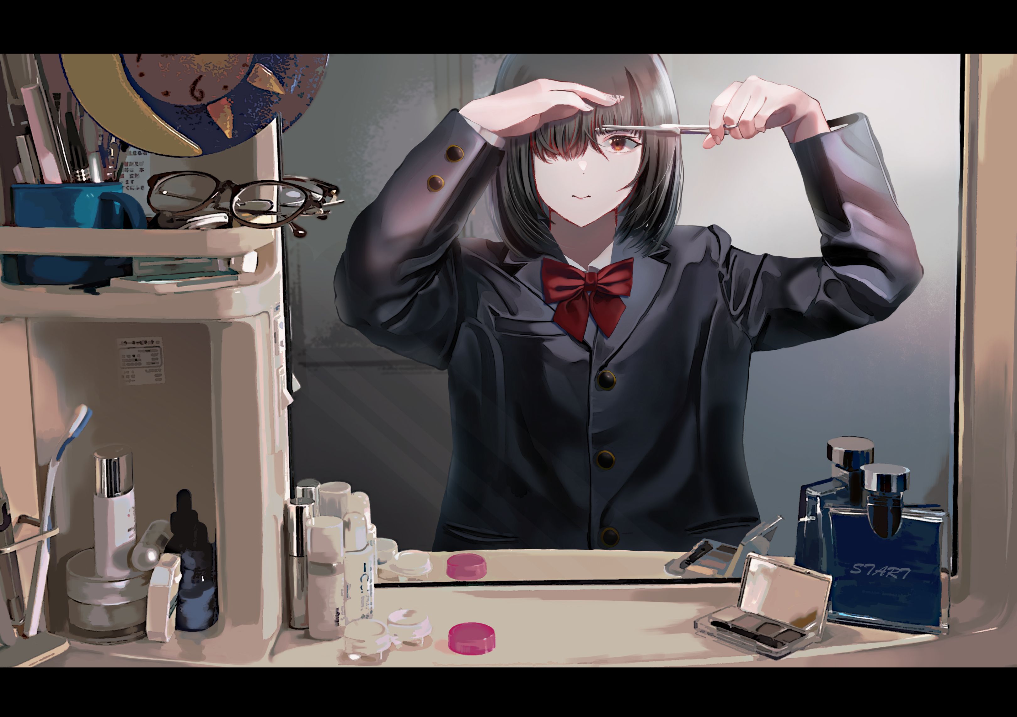 女の子もただ鏡の前に立ってるのではなくて、少し小首をかしげて髪を触って、新しい生活へのワクワク感を感じます。手前の頭が被写界深度の影響でボケたり、鏡に写った時計が登校時間で反転していたり、レンズフレアがおしゃれに取り入れられたり、細かなテクニックで丁寧に仕上げているのが特に良いなと感じました。