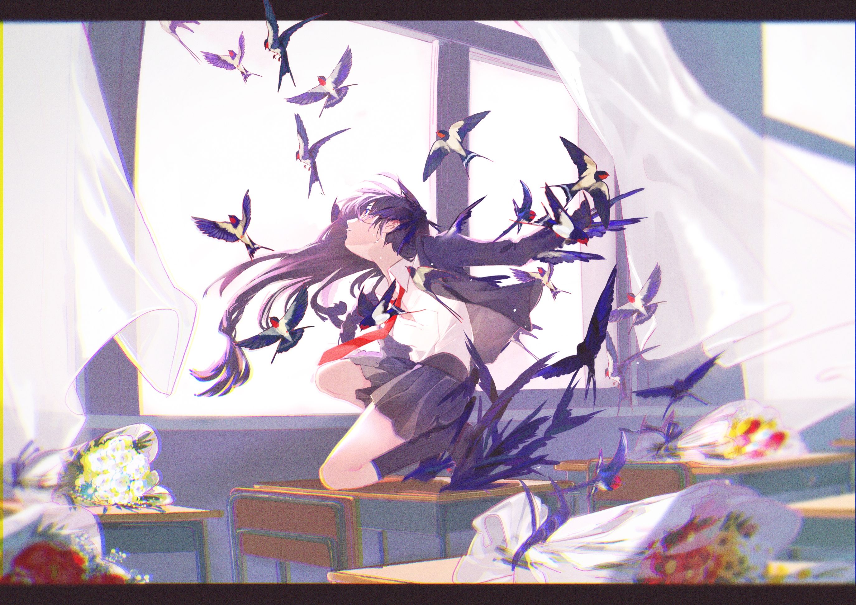 どうして皆の机に花束があるのか?どうして女の子がツバメになっているのか?作者さんのコメントを見るまでは気づかなかったのですが、理解せずともしっかりと「はじまり」を感じさせているのが凄いです!