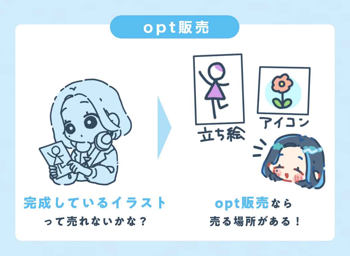 opt販売は、クリエイターがあらかじめ制作したオリジナルキャラクター等を、一点物の商品として販売する形式です。