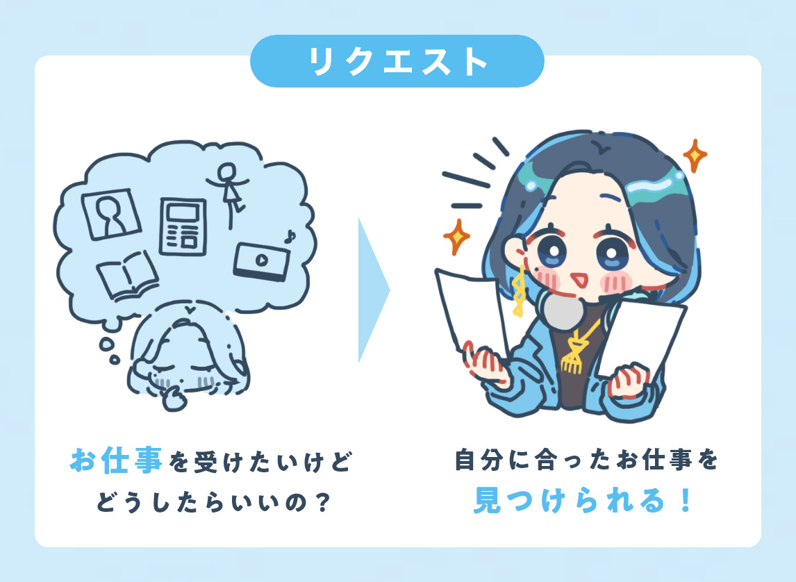 SNSのアイコンやヘッダー、一枚絵、キャラクターデザイン、立ち絵など、個人依頼のイラスト需要と非常に相性がよく、イラストをメインに活動しているクリエイターにとっては、お仕事獲得につながりやすいプラットフォームです。