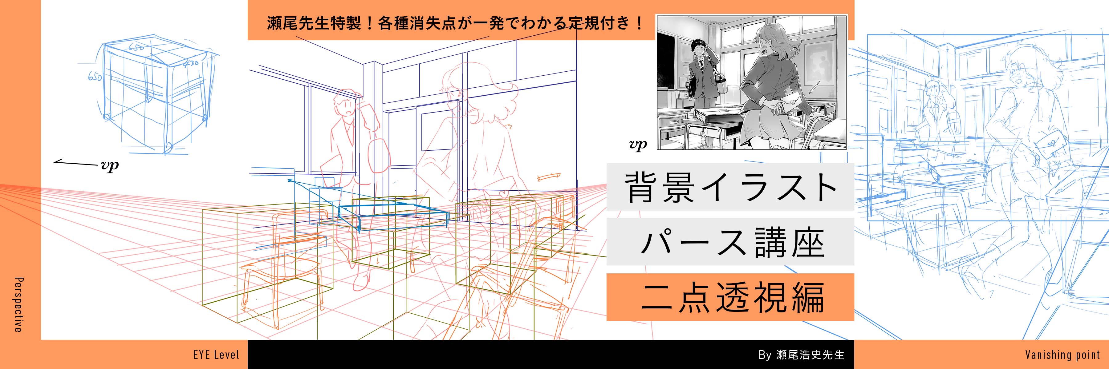 2点透視で背景作画をしたり、人物をパースに沿わせたり、作画に必要な知識を網羅的に解説します。