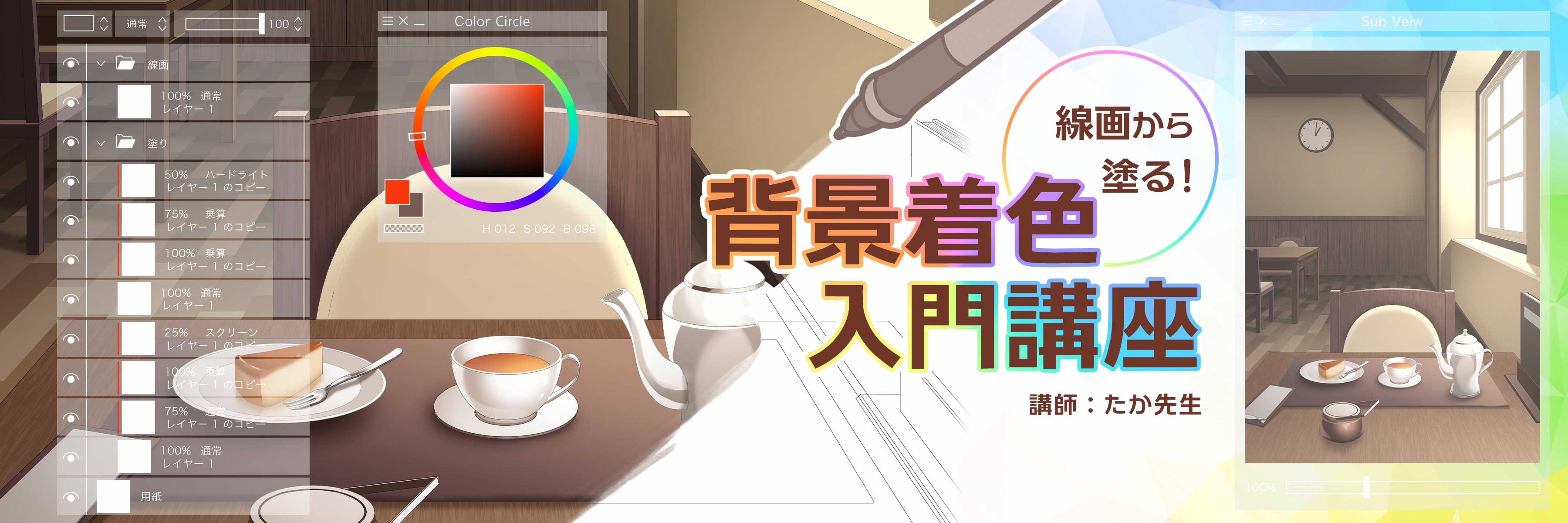 この講座は、線画をもとに背景を塗る際の基本的なテクニックを学べる背景着色講座です。