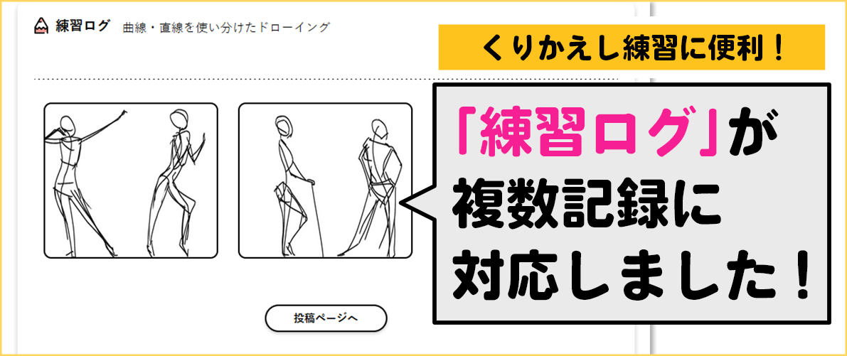 過去の練習記録を残しておけるようになったので、「ジェスチャードローイング」のようにくりかえし練習する講座のほか、講座の練習課題を複数描いたときなどにも便利です。